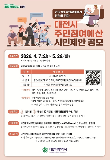 참여 대상은 대전시민, 대전 소재 직장인, 비영리민간단체 회원, 학생 등이며, 시민이 직접 사업을 제안해 시정에 참여할 수 있다.