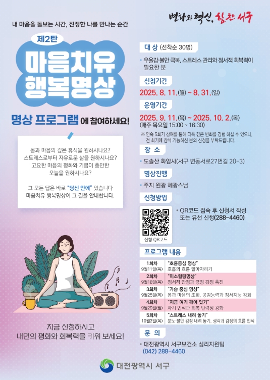 서철모 구청장은 “이번 명상 프로그램이 주민들의 스트레스를 완화하고 마음의 평화를 되찾는 계기가 되길 바란다”며 “앞으로도 정신적·신체적 건강을 함께 챙길 수 있는 다양한 프로그램을 지속적으로 마련하겠다”고 말했다.
