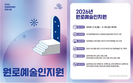 강원문화재단 신현상 대표이사는 “이번 지원사업을 통해 원로예술인의 예술적 성과를 지역사회에 널리 알리고, 강원 문화예술의 정체성을 더욱 공고히 하겠다”며 많은 예술인의 관심과 참여를 당부했다.