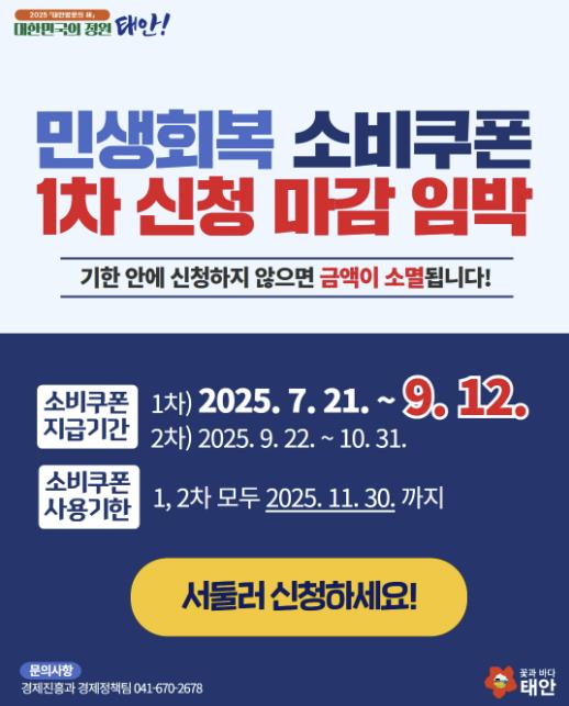 1차 소비쿠폰 신청은 온·오프라인으로 가능하며, 신용·체크카드 또는 태안사랑상품권 중 원하는 지급방식을 선택할 수 있다. 미성년자의 경우 주민등록 세대주가 신청·수령하면 된다.