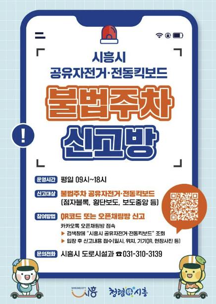 신고방은 카카오톡에서 ‘시흥시 공유자전거 · 전동킥보드 불법주차 신고방’을 검색하거나, 시에서 배포한 홍보물에 부착된 정보무늬(큐알코드)를 스캔하면 바로 접속할 수 있다. 운영 시간은 평일 오전 9시부터 오후 6시까지다.