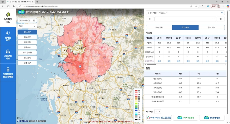 ‘농업기상과 병해충 시스템’은 기상청과 도내 34개 자동기상관측기에서 수집된 데이터를 기반으로 240m급 고해상도 지도를 통해 농장별 시각화된 기상정보를 제공한다. 단기는 물론 중기 예보도 통합 제공돼 날씨 변화에 대한 예측이 가능하다.