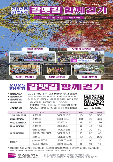 이번 하반기 행사에는 ▲직장인(30~50대)을 대상으로 갈맷길의 대표 코스를 체험하는 ‘직장인 원정대’와 ▲타지역 영향력자(인플루언서)를 초청해 갈맷길의 매력을 알리는 정보 제공형 ‘갈맷길 홍보 여행(팸투어)’ 프로그램이 신규로 운영된다.