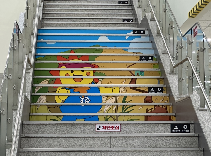 건강계단 설치는 센터를 방문하는 군민들이 계단을 이용하는 과정에서도 자연스럽게 건강 메시지를 접할 수 있도록 구성됐다. 건강계단은 각 단마다 칼로리 소모, 심혈관 건강, 일상 신체활동의 중요성 등의 메시지를 시각적으로 배치해, 건강 인식과 실천을 동시에 유도한다. 또한 울주군의 상징 캐릭터인 해뜨미 캐릭터를 배치하여 울주군만의 특성을 잘 살렸다.