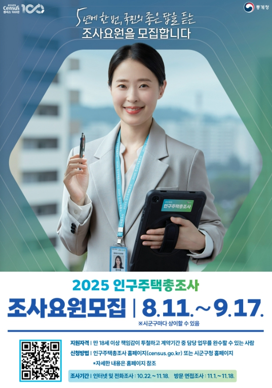 지원자격은 만 18세 이상으로 조사기간 중 조사에 전념할 수 있는주민이면 누구나 신청이 가능하고 △인구주택총조사, 가구주택기초조사 등 통계조사 유경험자, △조사 지역 거주자, △스마트폰‧태플릿 등 스마트 기기 활용이 원활한 자, △저소득층, △다자녀 보육가구, △북한이탈 주민, △장애인, △국가유공자 등을 우대 선발한다.