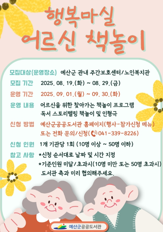 ‘행복마실 어르신 책놀이’는 도서관 방문이 어려운 어르신들을 위해 예산군 공공도서관이 추진해온 ‘찾아가는 도서관’ 서비스의 일환으로, 독서 약자를 위한 능동적인 문화복지 실현을 목표로 하고 있다.