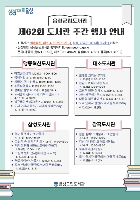 이번 행사에 참여를 원하는 군민은 음성군립도서관 홈페이지를 통해 접수가 가능하다. 맹동혁신·대소도서관은 4월 1일, 삼성·감곡도서관은 3월 31일부터 신청할 수 있다.