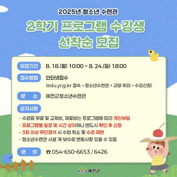 수강신청 기간은 이달 18일 10시부터 24일 18시까지며 예천군 통합교육포털을 통해 선착순으로 접수한다. 프로그램에 대한 상세 내용이나 기타 문의는 예천군청소년수련관으로 연락하면 된다.