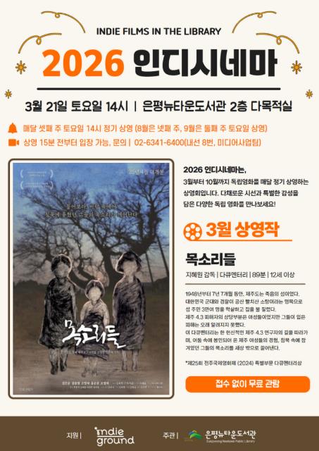 은평뉴타운도서관 관계자는 “2026 인디시네마를 통해 주민들이 독립영화와 예술영화를 보다 친숙하게 접하길 바란다”며 “앞으로도 영상문화 프로그램을 확대해 문화 향유 기회를 넓혀가겠다”고 밝혔다.