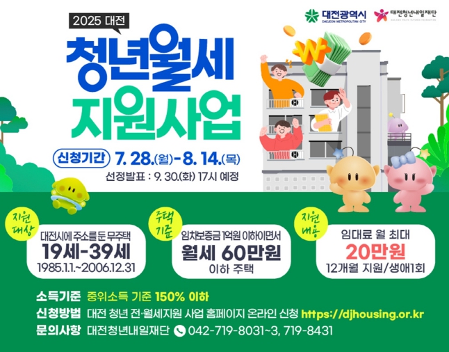 신청 대상은 신청일 기준 대전시에 주민등록을 두고 있는 19세 이상 39세 이하(1985년 1월 1일부터 2006년 12월 31일 출생) 무주택 청년으로, 가구 기준 중위소득 150% 이하여야 한다.