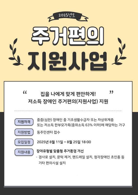 지원이 선정된 가구에는 전문 시공업체가 맞춤형 개조를 진행하며, 장애인 주거환경 개선 전문가들이 자문에 참여해 전문적이고 체계적인 지원이 이뤄질 예정이다.
