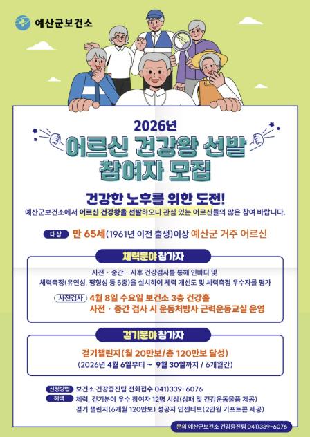 근력 분야는 인바디 측정을 통해 체중 대비 골격근량 비율이 가장 높은 참여자를 선정하며, 체력·걷기·근력 분야 우수자와 최고령 건강왕을 포함해 총 15명의 ‘어르신 건강왕’을 선발할 계획이다.