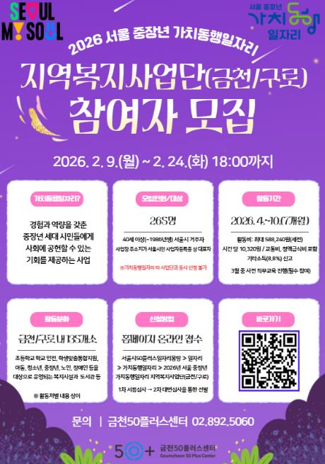 유성훈 금천구청장은 “중장년 세대의 경험과 전문성은 지역 사회에 큰 자산”이라며, “의미 있는 사회공헌 활동을 통해 새로운 인생 2막을 설계하길 바란다”라고 말했다.