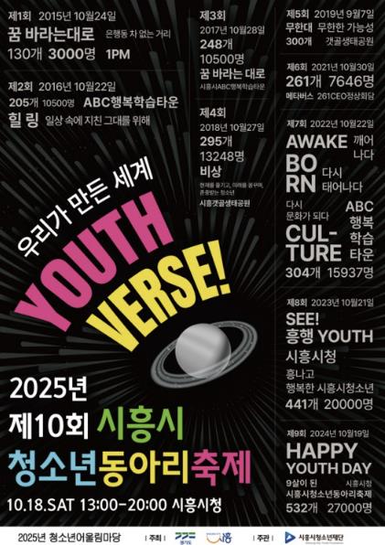 청소년동아리축제는 시흥시 청소년의 가장 큰 축제다. 청소년 동아리 지원 사업에 참여하는 모든 동아리가 함께 모여 1년간 활동과 성과를 공유하는 장이다. 올해는 10주년을 기념해 1회부터 9회까지 동아리축제 아카이브와 청소년동아리사업의 국내외 교류방안을 모색하는 포럼도 열려 청소년뿐 아니라 지역사회의 관심이 높게 나타나고 있다.