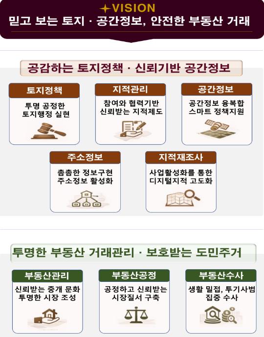 추진계획은 ▲투명하고 균형 잡힌 제도 운영으로 신뢰받는 토지행정 실현 ▲참여와 협력을 통한 신뢰받는 지적제도 정착 ▲공간정보 융·복합을 통한 스마트한 정책 지원 ▲촘촘한 주소정보 구현 및 주소정보 활성화 추진 ▲사업활성화를 통한 디지털지적 고도화 ▲신뢰받는 중개 문화와 투명한 부동산 시장 조성 ▲공정하고 신뢰받는 시장질서 구축 ▲생활밀접, 투기사범 집중수사 등 8대 전략을 바탕으로 한 92개 세부 이행과제로 구성됐다.