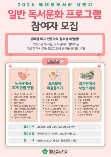 도서관 관계자는 “동대전도서관에서 시민들이 책과 문화 활동을 통해 함께 소통하고 성장할 수 있기를 바란다”라며 “앞으로도 일상 속에서 인문학적 감수성을 느낄 수 있는 다채로운 프로그램을 지속적으로 선보이도록 하겠다”라고 말했다.
