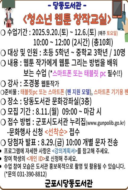 하은호 군포시장은 “웹툰 분야에 관심있는 청소년들에게 웹툰 창작의 기회를 제공하고 웹툰에 대한 이해와 창의력을 증진할 수 있는 기회가 되길 바란다” 라고 말했다.