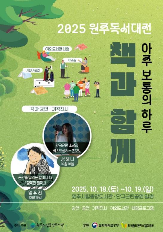 독서대전 기간 단구근린공원 열린광장에서는 야외도서관도 열린다. 도심 속 공원에서 즐기는 독서 공간 ‘책과 함께, 아보하’, 지역 아티스트·밴드 공연 ‘책과 함께, 공연’, 다양한 체험 부스 ‘책과 함께, 체험’이 시민들과 만날 예정이다.