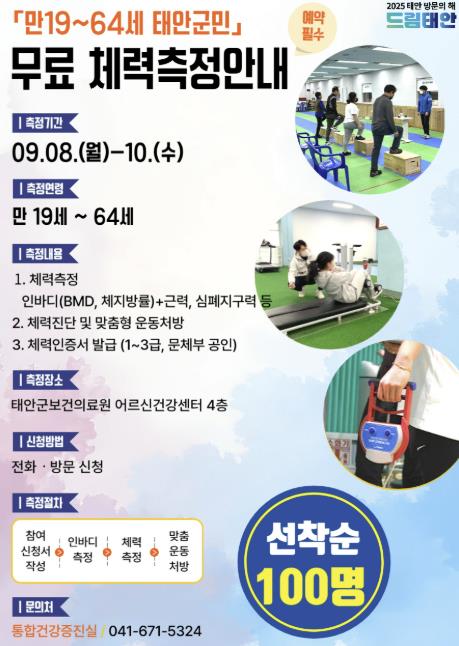 태안군에 따르면, 태안군보건의료원은 9월 8일부터 10일까지 3일간 의료원 어르신건강센터 4층에서 만 19세~64세 군민 100명을 대상으로 체력측정을 진행한다.