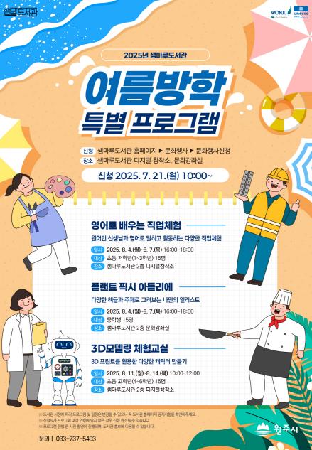 박순덕 도서관장은 “이번 여름방학 특별 프로그램을 통해 아이들이 창의력과 폭넓은 상상력을 키우는 기회를 얻길 바란다.”라고 전했다.