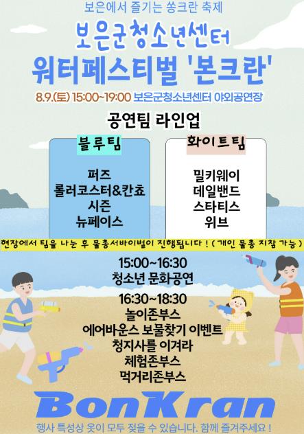 이옥순 주민행복과장은 “청소년들이 이번 행사를 통해 즐거운 추억을 만들고, 시원하고 뜻깊은 방학을 보내길 바란다”며 “앞으로도 보은군 청소년들을 위한 다양한 문화 활동의 기회를 지속적으로 마련하겠다”고 말했다.