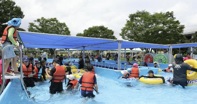 올해 뱃들공원 물놀이장은 조립식 풀장을 어린이·청소년용으로 구분하고, 유수풀, 중형 워터슬라이드, 워터버켓, 페달보트, 워터롤, 분수터널 등 다양한 놀이 시설을 추가해 물놀이의 재미를 높였으며 에어풀, 워터팡팡, 징검다리 슬라이드 등 유아 전용 공간도 별도로 마련돼 있어 영유아부터 초등학생, 청소년까지 전 연령대 아이들이 안전하게 즐길 수 있다.