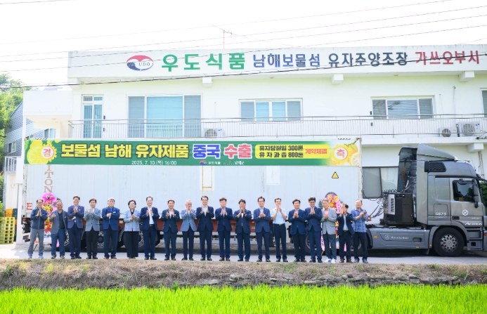 남해군은 지난 10일 오후 고현면 소재 우도식품에서 장충남 남해군수를 비롯해 군의회, 행정, 농협, 우도식품 관계자 등 약 15명이 참석한 가운데 보물섬 남해유자 제품 수출 선적 행사를 개최했다.
