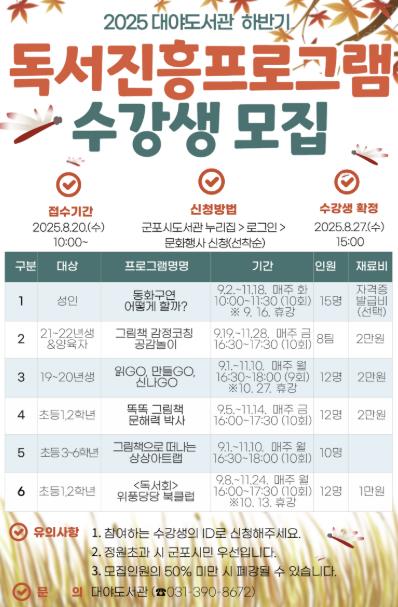 수강신청은 8월 20일 10시부터 군포시도서관 누리집에서 선착순으로 진행한다. 수강료는 무료이며 재료비(자격증발급비) 등은 본인 부담이다.
