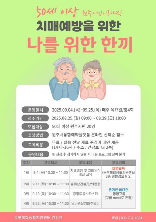 모집 인원은 50대 이상 지역 주민 20명이며, 신청은 8월 25일 오전 9시부터 원주시 통합예약플랫폼에서 선착순으로 접수한다.