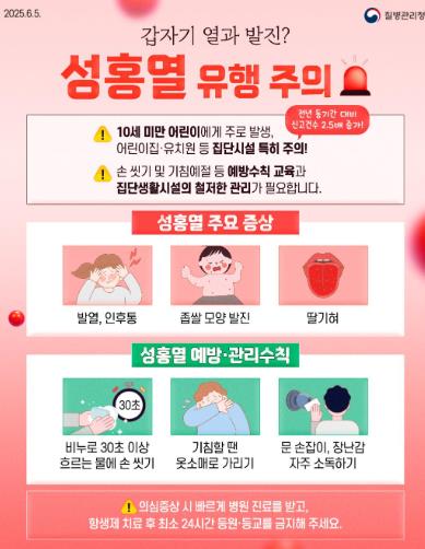 군산시 보건소 관계자는 “여름철 방학 기간에도 학원, 돌봄 교실 등에서 밀접 접촉하는 경우가 많아 성홍열을 포함한 각종 호흡기 감염병의 전파 위험이 높아질 수 있다.”라며 “의심 증상이 나타나면 신속히 의료기관을 찾아 진료를 받고 손씻기 등 개인위생 수칙도 준수해줄 것.”을 당부했다.