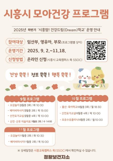 모든 프로그램은 전문 강사가 진행하며 실용적이고 체계적인 교육 내용을 제공한다. 특히 ‘출산ㆍ육아학교’는 부부가 함께 참여할 수 있도록 야간 시간에 운영돼 건강한 출산 준비와 육아 자신감 향상에 실질적인 도움이 될 것으로 기대된다.