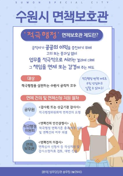 수원시 관계자는 “공직자가 공공의 이익을 위한 일에 주저하지 않고 적극적으로 나설 수 있도록 제도적 기반을 강화하고 있다”며 “적극행정 면책보호관 제도가 현장에서 실질적인 보호장치로 작동해 공직사회에 능동적이고 책임감을 느끼며 일하는 문화가 확산되길 바란다”고 말했다.