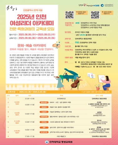 한편, ‘2025 인천 여성리더 아카데미’는 ▲기본과정 ▲문화·예술 아카데미 ▲건강관리 아카데미 등 총 3개 과정으로 운영되며 지난 5월에는 ‘AI로 여는 미래, 창의력으로 실현하는 성공’을 주제로 한 기본과정을 통해 60명의 수료생을 배출했다.