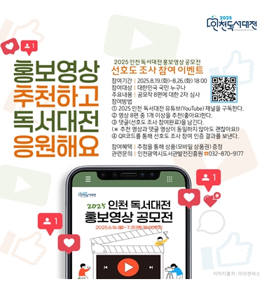 정윤희 시 문화정책과장은 “인천 독서대전은 책을 매개로 시민이 하나 되는 대표 문화축제”라면서, “시민들의 의견이 반영된 기발하고 대중적인 독서대전 홍보영상이 선정되길 기대한다”라고 말했다.