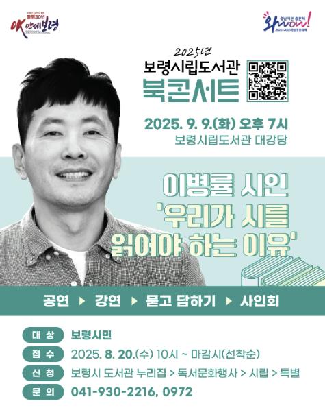 북콘서트 참여를 희망하는 시민은 8월 20일 오전 10시부터 보령시 도서관 누리집을 통해 선착순으로 신청할 수 있다. 자세한 내용은 보령시 도서관 누리집을 참고하거나 문화교육과로 문의하면 된다.