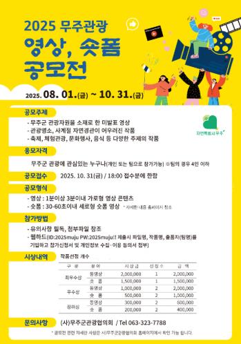 “2025 무주 관광 영상·숏폼 공모전” 관련 자세한 내용은 (사)무주군관광협의회 누리집 공지 사항을 참고하거나 전화로 문의하면 된다.