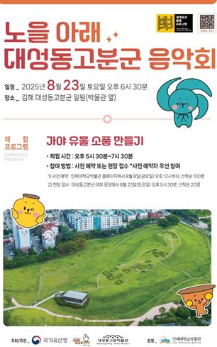 국가유산청 공모사업인 ‘2025 세계유산 활용프로그램’의 일환으로 선정돼 세계유산 대성동고분군의 탁월한 보편적 가치를 음악과 체험으로 시민들과 향유 하고자 기획됐다.