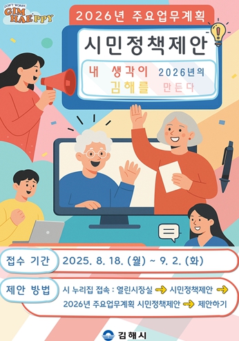‘내 생각이 2026년의 김해를 만든다’란 주제 아래 8월 18일부터 9월 2일까지 김해시민 누구나 내년도에 희망하는 사업들을 분야별로 제안할 수 있다.