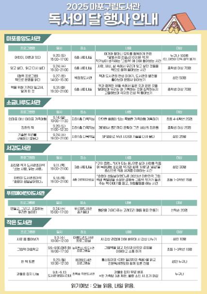 또한 마포푸르메어린이도서관의 ‘고래꼬리 매듭 팔찌 만들기’, 아름드리작은도서관의 ‘시로 몸 틀어보기’, 늘푸른소나무작은도서관의 ‘그림책 마음학교’등 다양한 도서관에서 개성 넘치는 행사가 진행된다.