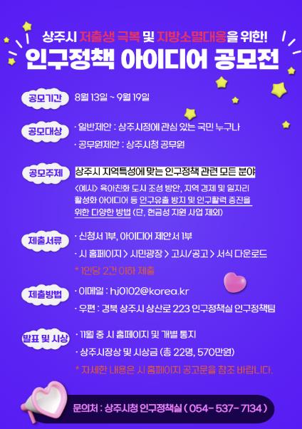공모분야는 ▲저출생 대응 ▲청년‧일자리 ▲인구유입 확대 ▲주거‧환경 ▲고령사회 대응 등이며, 상주시 지역 특성을 반영한 인구정책 관련 모든 제안을 접수한다.