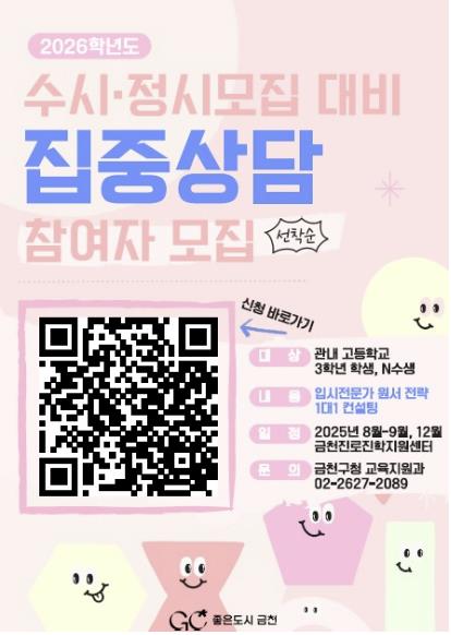 유성훈 금천구청장은 “이번 프로그램은 입시 일정을 촘촘히 반영해 기획된 만큼, 수험생들이 각 단계에서 필요한 정보를 적시에 얻고 진학을 준비 할 수 있도록 돕는 데 중점을 두었다”라며 “진학을 앞둔 모든 학생과 학부모의 적극적인 관심과 참여를 부탁드린다”고 밝혔다.