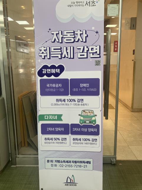 이에 구는 국가유공자, 장애인, 다자녀 등 차량취득세 감면 대상자가 감면 요건과 감면 후 준수해야 할 의무사항을 쉽게 확인할 수 있도록 ‘차량취득세 감면 홍보 배너’를 제작해 자동차등록 민원실 입구에 상시 비치했다. 배너에 있는 QR코드를 스캔하면 구청 홈페이지의 ‘감면 의무사항 안내’ 페이지로 바로 연결돼 감면 요건과 준수사항 등 자세한 내용을 쉽게 확인할 수 있다.