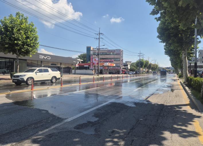 이 시스템은 우산동 우산공단삼거리에서 유원삼거리까지 약 500m 구간에 설치됐으며, 도로 중앙선에 설치된 장치가 노면에 물을 분사해 아스팔트의 온도를 낮춘다. 또한 타이어 분진 등 도로변 미세먼지를 제거하는 효과도 있다.