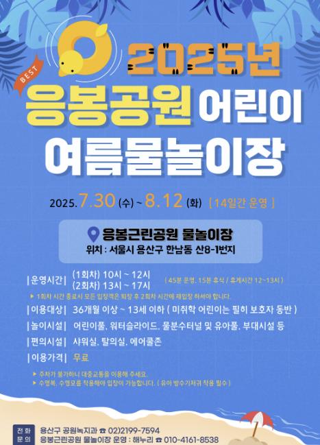 구는 여름철 무더위를 식힐 수 있는 ‘도심 간이 물놀이장’을 효창공원과 응봉공원 내 설치해 운영한다. 물놀이장은 7월 30일부터 8월 12일까지 총 14일간, 오전 10시부터 오후 5시까지 매일 운영된다. 이용료는 무료이며, 우천 또는 천재지변 상황을 제외하고 휴장일 없이 진행된다.