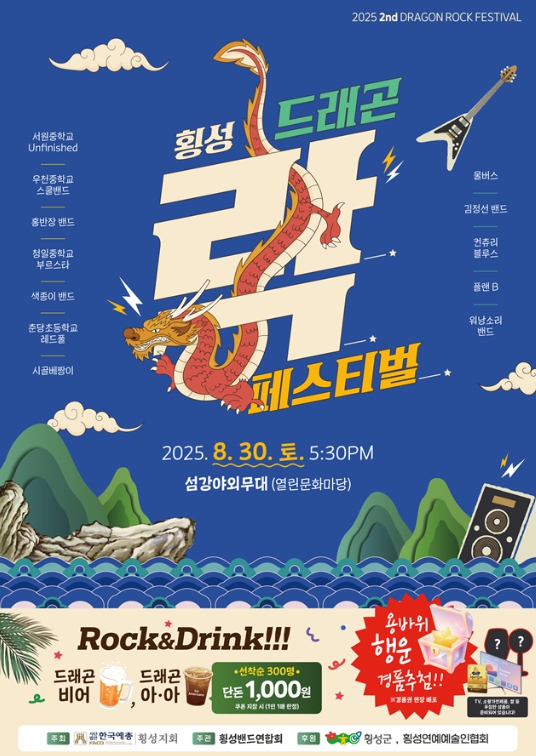 이번 공연을 주관한 조진영 횡성밴드연합회장도 “섬강의 용바위 전설처럼 이번 락 페스티벌이 지역민의 열정과 에너지를 하나로 모으는 계기가 되길 바란다”며 “남녀노소 모두가 함께 즐기고 교류하는 축제가 되기를 바란다”고 전했다.