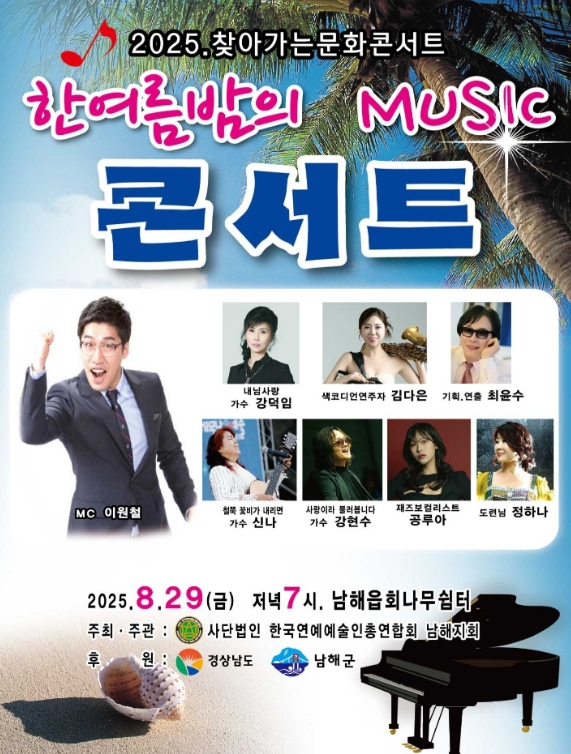 김지영 남해군 문화체육과장은 “찾아가는 문화콘서트 – 한여름 밤의 Music 콘서트는 다양한 장르의 공연을 군민 누구나 가까이에서 즐길 수 있도록 마련한 자리”라며, “가을이 오기 전, 여름의 열기를 함께 즐기며 주민들에게 잊지 못할 여름밤의 추억이 되기를 바란다”고 밝혔다.