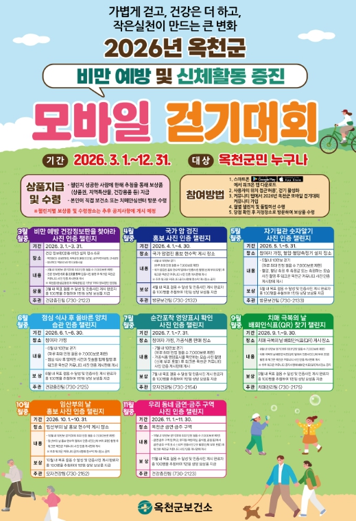 참여 방법은 스마트폰에 모바일 걷기 플랫폼인 ‘워크온’ 앱을 설치하고 ‘2026년 옥천군 모바일 걷기대회’ 커뮤니티에 가입 후 월별 걷기 및 건강생활실천 챌린지에 참여하여 미션을 수행하면 된다.