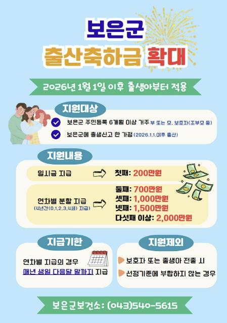 지원 기준은 2026년 1월 1일 이후 보은군에 출생신고 한 가정으로 보호자가 출생일 기준 6개월 이전부터 군에 주민등록을 두고 있어야 하며, 출산축하금 지원사업에 대한 자세한 사항은 건강증진과 모자보건팀으로 문의하면 된다.