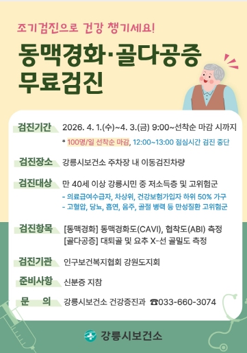 김유영 건강증진과장은 "동맥경화와 골다공증은 초기 증상이 뚜렷하지 않아 방치할 경우 심뇌혈관질환과 골절로 이어질 수 있다"면서 “만 40세 이상 시민은 질환을 조기에 발견하고 건강 상태를 점검할 수 있도록 이번 검진에 적극적으로 참여해주길 바란다”고 말했다.
