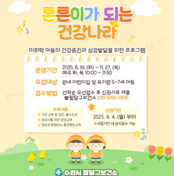 튼튼이가 되는 건강나라는 구강·영양·금연 교육을 연계해 아동들이 건강한 생활 습관을 형성하도록 돕는, 예방과 실천 중심 교육 프로그램이다. 8월 19일부터 11월 27일까지 매주 화·목요일 오전 10시부터 11시 30분까지 팔달구보건소 구강보건실, 대강당실에서 프로그램을 진행한다.